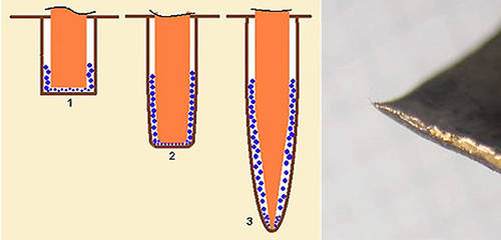 Изначально тупая кромка трубки как в ступке истирает друг о друга абразивные зёрна, одновременно выдавливая их из-под себя в стороны, к керну и к стенке отверстия. Здесь они начинают стачивать «углы» кромки. А когда выдавятся из-под торца и измельчатся практически все, кромка добирается до дна канавки и начинает его гладить, а вытесненные в стороны зёрна всё больше её затачивают, и она (спереди кромка не тупится – гладит дно) заметно заостряется. Донная канавка приобретает V-образный профиль. Эксперименты показывают, что трубку с заострившейся кромкой вращать становится заметно легче.