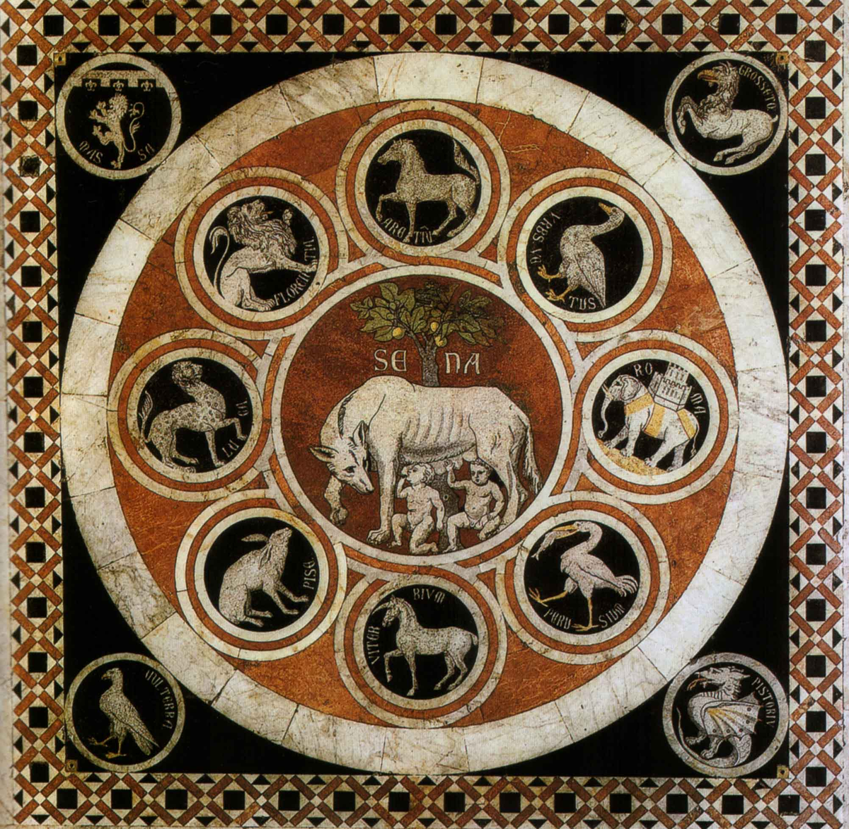 Гербы городов на полу собора в Сиене (Италия), Герб Сиены с Волчицей в центре, герб Рима со Слоном - справа.